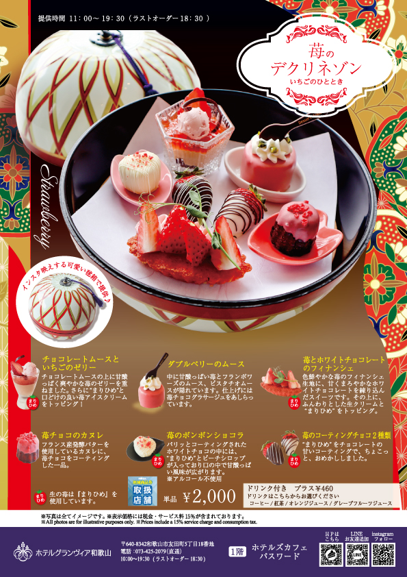 和歌山産の苺“まりひめ”を一部使用している「苺のデクリネゾン」を4月1日(水)から、器を新たにご提供いたします。ころんとまん丸の毬の器で見た目も可愛く、さらに和歌山らしさをプラスしました。お楽しみください。