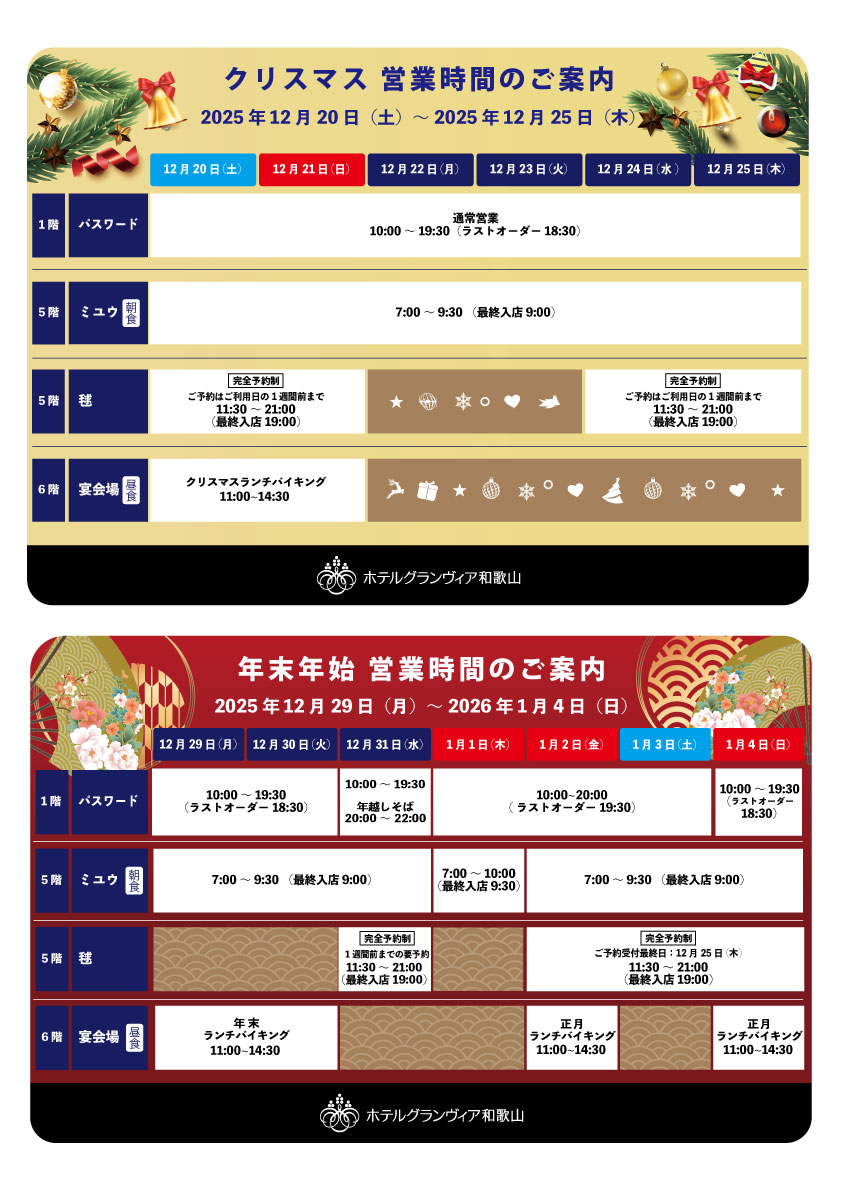 | お正月特別営業 2026年1月2日(金)~4日(日) | 11:30~21:00(最終入店19:00) ※2025年12月25日(木)までの要予約 |